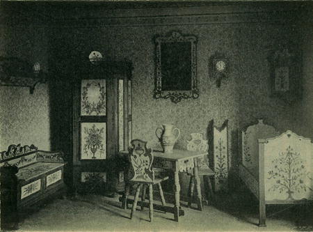 „Nábytek s lidovým ornamentem dle návrhu J. Lišky. Fotografoval J. Picek v Jičíně.