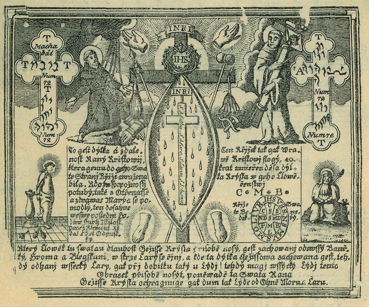 Tyto modlitby zároveň s vyobrazením byly na tabulky otiskovány a zavěšovány v příbytku a na dveřích jako »Domovní požehnání«. Zajímavý exemplář zaslal »Českému Lidu« známý pracovník v oboru lidovědy, pan Jos. Cyterák, správce školy ve Vel. Gičovicích. Podáváme reprodukci této vzácné tabulky (zapůjčil laskavě p. K. Hrabě, statkář tamtéž) ukázkou, v jakou podobu se původní »délka« skutečná, mírou naznačená, změnila.