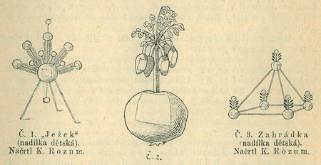 anebo švestka. Týmž způsobem se napíchá ještě jedna podobná, nižší řada. Prázdná místa mezi těmito dřevěnými paprsky se vyplní nabodnutím snítek brusin nebo zimostrázu. Tato vrchní ozdoba ježka se nazývá korunou. Bohatěji okrášlený ježek sluje králem. Malounké jablíčko na nitce upevněné a přivázané ke stopce tvoří zvoneček ježka. Na konec se nalepí na každé jednotlivé ovoce pozlátko. (Č. 1) Na Klatovsku říkají ježkovi svět. Podobným způsobem se upraví t ř e s o 1 k a bez nožek. Do prostřed ve směru svislém se nasadí po délce na větvičky (třásně) rozřezané brčko; každá tato větvička nese na konci svém nabodnutý, ve vodě rozměkčený hrášek nebo mandle s pozlátkem. (Č. 2. Kreslil prof. Jindř. Seehák.)