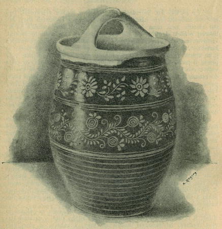Vyobr. č. 1. Košík, (koulník, kouřák, polívečnik) od Tomáše Rusa z Bechyně. Cena 23 kr. Celá vnější plocha je rozdělena na tři pásma. Hořejší dvě jsou zdobena vlnitými lodyhami, z nichž vyrůstají růžice, jablíčka a lupínky; na dolejším poli jsou vyznačeny obroučky.