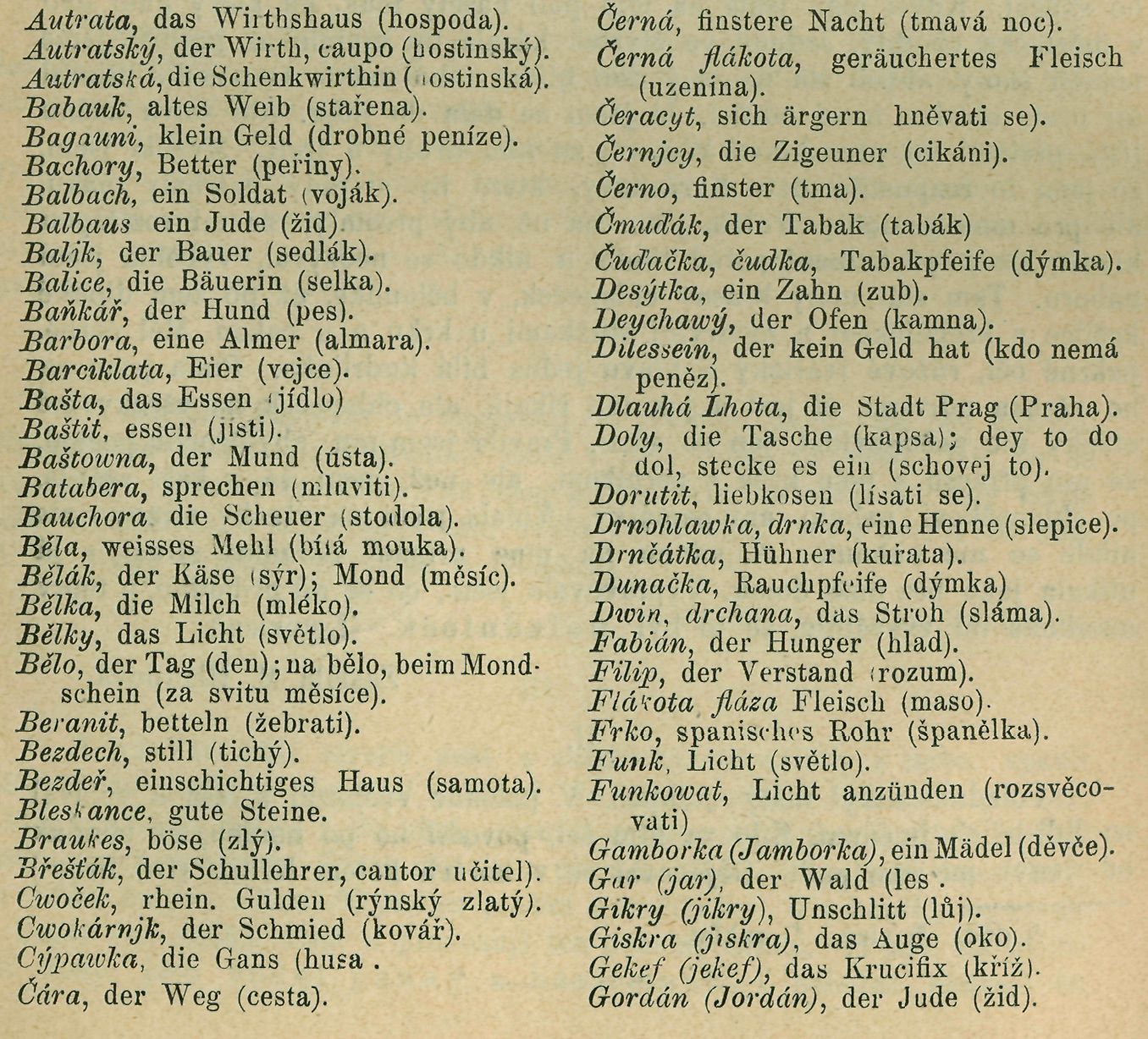 Dv. rada Dr. V. Jagié ve své studii o zlodějských a tajných řečích mezi lidem slovanským (viz název na str. 139.) uvádí Puchmajerovu sbírku slov českých z r. 1821. Článek Jud&v v čísle 3. vzbudil mimo nadání veliký rozruch (časopisy přinášely ukázky) a bylo vysloveno z několika vážných stran přání, aby pro srovnání byla Puchmajerova sbírka z knihy »Romani Gib«, dnes již vzácné, otištěna doslova v Českém Lidu. Vyhovuje tomuto přání, otiskuji sbírku Puchmajerovu. Shoda se sbírkou Judorou je značná. Ponechávám starý pravopis s německými vysvětlivkami, do závorek kladu česká slova. Exemplář bibliotheky Musea král, Českého má signaturu: 65. D. 38. Název: Puchmayer Ant. Jaroši. Romani Čib, das ist: Grammatik und Wörterbuch der Zigeuner Sprache, nebst einigen Fabeln in derselben. Dazu als Anhang die Hantýrka oder die Ge-chische Diebesprache, Prag, 1821, 8°, str. 81—8: Hantýrka.