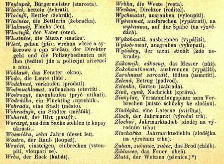 *) Několik slov převzatých z německé a židovsko-německé zlodějštiny: „Aisch, der Mann. — Aischin, das Weib. — Bausen sich fürchten. — Buser, das Fleiisch. — Egele, der Wagen. — Enaien, die Augen. — Flopen, der Keise-pass. — Geschiebes macheD, davon laufen — Gisar, das Dorf. — Handeln, stehlen — Hargen, sich ärgern — ChapeD, thapern, ganaffen, stehlen. — Chaser, das Schwein. — Jajem, der Wein. — Jaske, die Kirche — Kaporn, sterben. — Keim, ein Jude. — Masern verrathen. — Meistern, Jemanden binden. — Mes seyn, todt seyn. — Miesig, das Rad. — Milch, der Salz. — Masamaten saszern, Diebstähle ausspähen — Moos, Geld — Piller, der Hund — Pasen, verkaufen. — Eiegel, Füsse. — Saszern, ausspähen. — Schaufert, Kerkermeister — Scheigatzel, ein Knabe — Schechel, der Versland. — Scheucher, das Bier. — Scheukek, eine Lüge. — Schidler, besoffen. — Schiebes machen, entweichen. — Schnsosen, plaudern. — Spiser, Wirtb. — Veischüppet amtieren. — Warm, das Zimmer. — Weiches, das Gold."