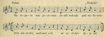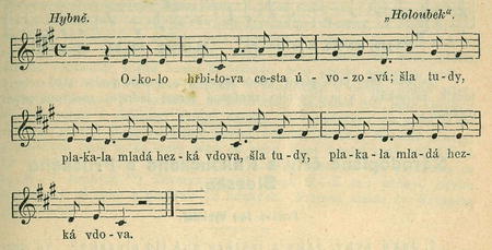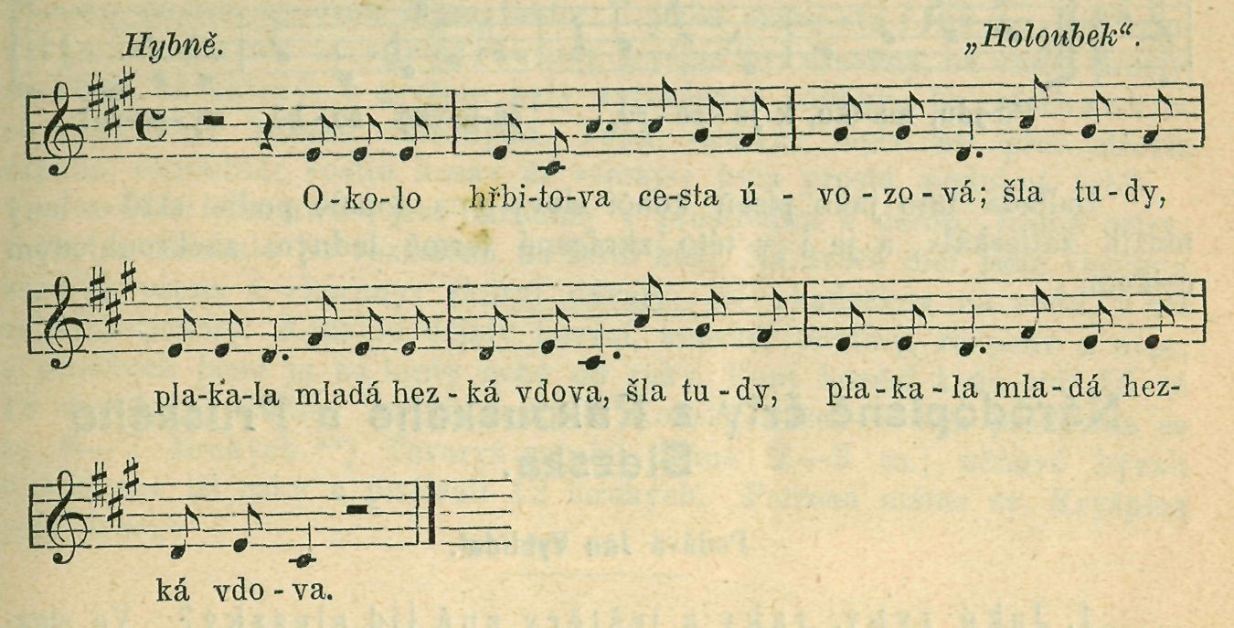 Na místo »cesia úvozová« zpívá se »je cesta vozová«, místo »tudy« klade se »po ní«. Zdá se mi. že nápěv tento nepřiléhá dosti těsně k obsahu, ač dal-li by se živý rytmus a vlnitější linie odůvodniti utajenou jízlivostí, což však epika na zřeteli obyčejně nemívá a nejméně v balladě léto.