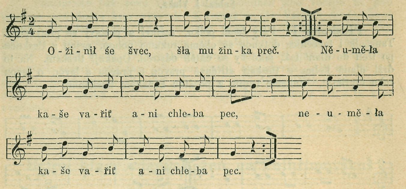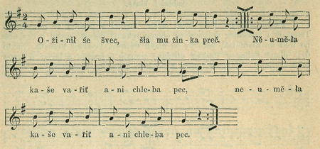 Švec. Páry stojí proti sobě, drží pěsli před sebou, otáčejíce jimi 1 takt; pak je rozpřáhnou kmitem napodobujíce takto ševče za šití. Opakuje se ještě třikrát a pak polka.