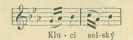 tálního nebo deklamačního. V taktu třetím a čtvrtém následkem analogie s prvním a druhým připadají krátké slabiky na dlouhé noty a také se dlouze zpívají. Zapsal jsem tuto píseň dvojhlasně, tak jak se vždy zpívá, sloužíť chlapcům jako přípitek (»tuš«). Muzikanti hrají sloky střídavě v tonice (Es dur) a dominantě (B dur, o quartu níž). Malý variant této písně má Erben ve své sbírce: »Kluci selský, safrahelsky« č. 312 notové přílohy, kterýžto text též na Chodsku jest znám (s matnějším : nechcete poslouchat mámy). Píseň Erbenova však v prvních čtyřech taktech zcela naDodobuie melodickv variaci: