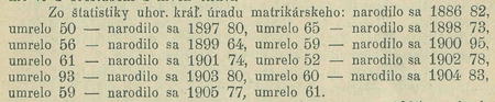 Narodilo sa r. 1904 ženských 49, mužských 34, r. 1905 ženských 42, mužských 35. Umřelo r. 1904 ženských 28, mužských 41, r. 1905 ženských 30, mužských 31. Nemocí, ktoré by pravidelné riadily v obyvatelstvu, nieto.