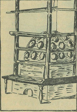 Stará kamna stála na zděném podkladě, na tomto spočívalo klenutí o několika kachlích. Kout světnice, který byl kamny obyčejně zabrán a pak tvar. kachlíků působil, že kamna přejímají tvar hranolu. Nad kamny lze viděti jakési lešení z dřevěných tyčí, kde se sušívá vlhké prádlo a mokrý, zmoklý oděv. Kolem kamen jest