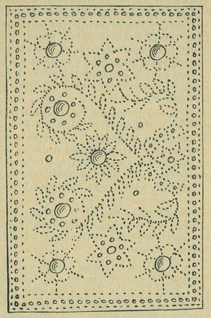 nákresy květů sty lisovaných, širokými stehy, tím, že nejsouce podloženy, zůstávají úplně plochými, a jsou šity pouze na líci látky, zůstavujíce na rubu jen malinké spojovací stehy, což mělo příčinu v šetrnosti, aby se neplýtvalo hedvábím tam, kde ho nebylo lze viděti.