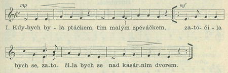 U nich ve vsi o muzice to muzikanti tak hráli prý —¦ s tím dodatkem. A velcí tak s nimi zpívali. Zjistil jsem, že tento přídavek zavinil jeden lidový kapelník. Napsal pro svoji kapelu tento »kousek« jako polku (trio); a jako ostatní lidoví skla-datelé-muzikanti, ani on nesnesl té pausy v ukončení (v repetici) . Musil tam něco přidat a přidal ten motivek dobře. Lidový člověk hned jak to uslyšel, musil si k tomu ovšem udělat slova. V písničce mluví dívka a naivně představuje si vojenský život.