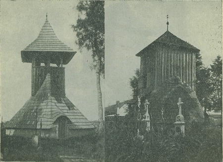 všimnutí dřevěné zvonice kostelní nebo hřbitovní. Jednoduché zvoničky neliší se svým rázem od zvoniček jinde známých. Zachovaly se také ještě u nás na několika místech. Ale zvonice kostelní nebo hřbitovní vynikají nejen většími rozměry, ale také architekturou.