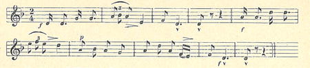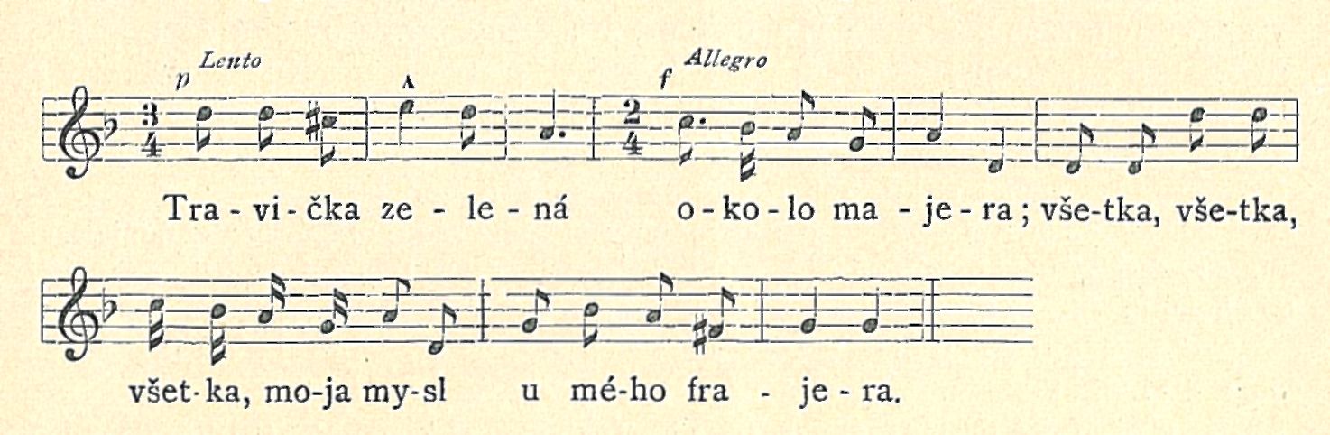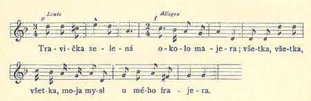 Pěkným příkladem, jak maďarská melodie přechází ve slovenskou píseň, je tento: