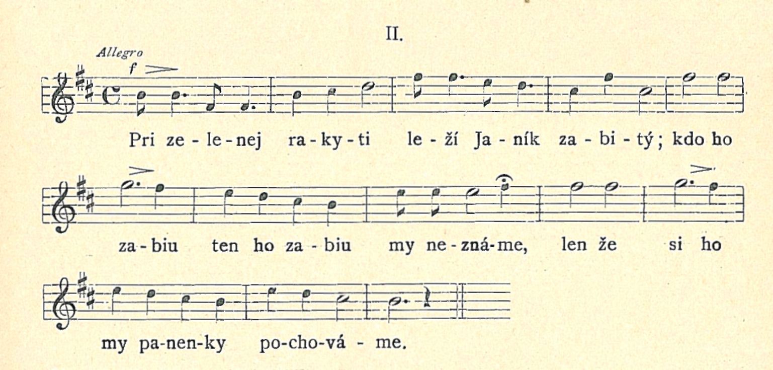Kde že pochováme ho, kde že položíme ho? Pochováme ho do hájka ; tam na hrobe zpievavat mu bude slavik v nočnej dobe. — Jeho věrná Mariška, oplakává Janíčka. »Zomrem od zial'u vel'keho, pamätajte, a potom ma к Janíkovi pochovajte.« — Od jaseni do jary, spadly růže s jej tvary, esce v poli bielé zítko nepožali, už mládenci pre Marišku hrob kopali. — . Vykopali jamičku к jej věrnému Janíčku. Hrob pri hrobe, telo s telom položili a na hrobe po ružičke zasadili. —