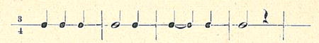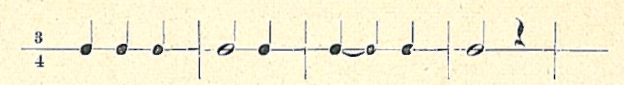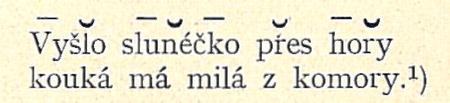Jak viděti dle přerývek, jsou první dva verše daktylskotrochejské a další verše přesně trochejské. Nápěv jest v'souhlasu s prvníma dvěma verši, v nesouhlasu však s celou další písní; patrně původní nápěv byl zde taktů sudonotových. Počátek písně nelze si jinak vysvětliti, než že původně zněl také trochejský; ale že nový nápěv si jej přizpůsobil. Původní znění těch veršů snad bylo: