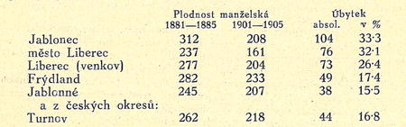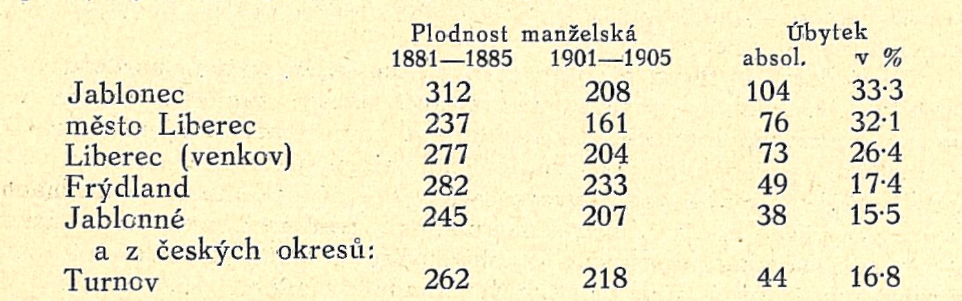 Dále na západě velmi silný pokles plodnosti má okres rumburský, ač jíž dříve měl nejméně manželských porodů v Čechách, a to 29-9%. Poměry na Rumbúrsku (nyní s okresem Warnsdorfským, r, 1908 odděleným) upomínají úplně na francouzské, na 1000 provdaných žen ve věku rodivém připadalo tu začátkem nynějšího století pouze 162 porodů, a do skutečného odlidňování nemají tyto kraje daleko, К Rumbúrsku připojuje se okres šluknovský s úbytkem 14'l%ním, z jihu děčínský (— 24%) a ústecký (— 14-1%),