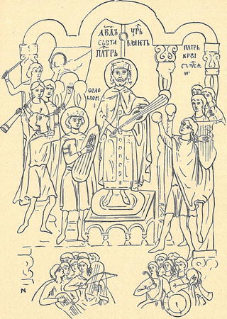 Obr 8 Titulní miniatura žaltáře Chludovského, představující hudební koncert krále Davida (XIII.—XIV. stol.).