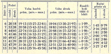 Roční přírůstek se okolo 8. až 9. roku poněkud snižuje, ale později— a zvláště po 11, až 12. roce — zvětšuje. Také podle změn váhy tělesné dospívají dívky asi o jeden rok dříve než hoši. Rozdíl mezi hochy a dívkami se také ohledně váhy stále zmenšuje, tak že dívky po 11, roce v tom ohledu předčí hochy stejného stáří, a to jak v průměrných číslicích tak v dosažených hodnotách maximálních.