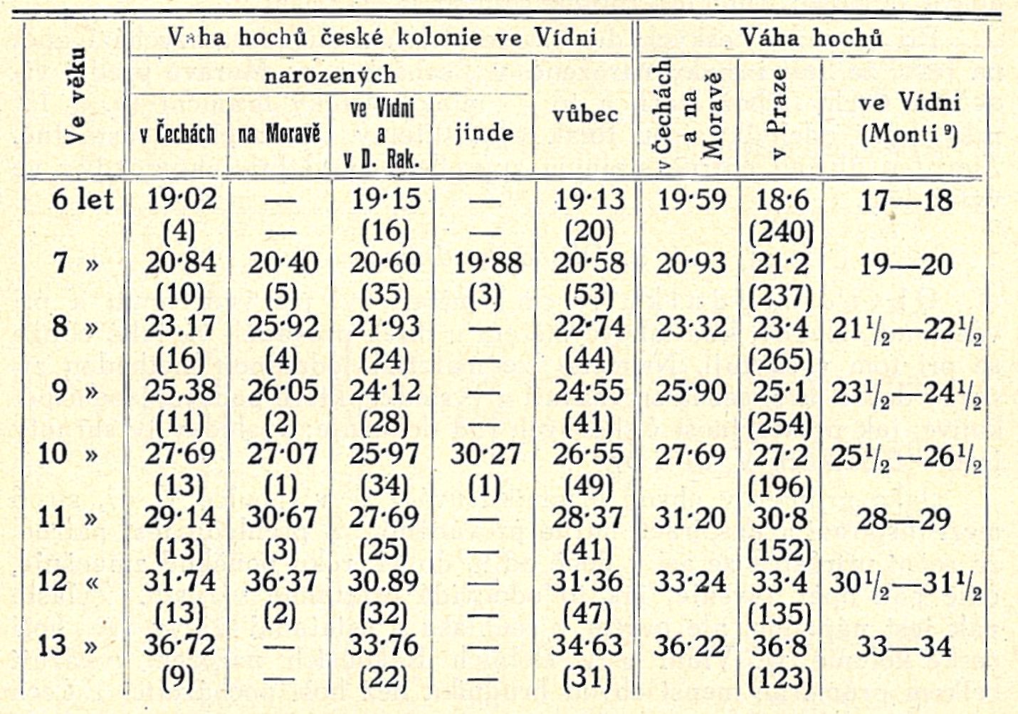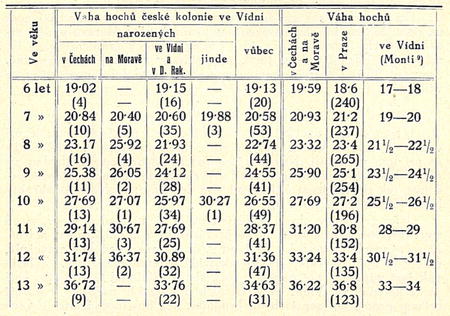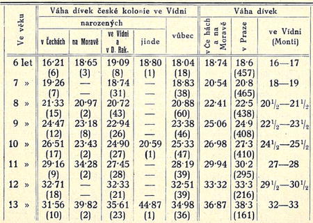 Tab. IV. b) Průměrná tělesná váha dívek české kolonie ve Vídní dle původu a v srovnání s jinými dívkami (v kg),