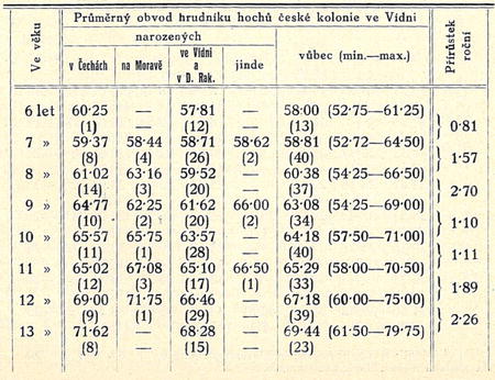 Při srovnání českých dítek vídeňských mezí sebou vychází opět na jevo, že hoši i dívky narozené v Čechách a na. Moravě předčí vídeňské Čechy téhož stáří, a to — mimo ročníky hraniční (6. a 13. rok), kdež odchylky jsou jinak vysvětlitelný, — zcela konstantně. Zjev tem dlužno patrně stejným způsobem vysvětlit! jako rozdíly ve výšce těla.