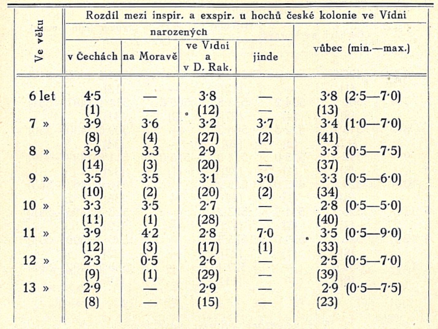 Relativní kapacitu plic, t. j. množství vzduchu, které při mírném dýchání se v dýchacích ústrojích vyměňuje, možno do jisté míry odhadnoutí dle rozsahu dýchání, t. j. dle rozdílu mezi mírnou inspirací a exspirací. Dotyčné výsledky jsou sestaveny na tabulce V. b). Také v tom ohledu jeví hoši z Čech a z Moravy převahu nad hochy ve Vídní narozenými. Na první pohled překvapuje zjev, že této hodnoty cd roku k roku nepřibývá, nýbrž spíše ubývá; to jest však vysvětlitelno z okolností, že obvod hrudníku roste v jiném poměru než prostor, který objímá, a že se způsob dýchání během vzrůstu pozvolna změní (z thorakálního v abdominální), .