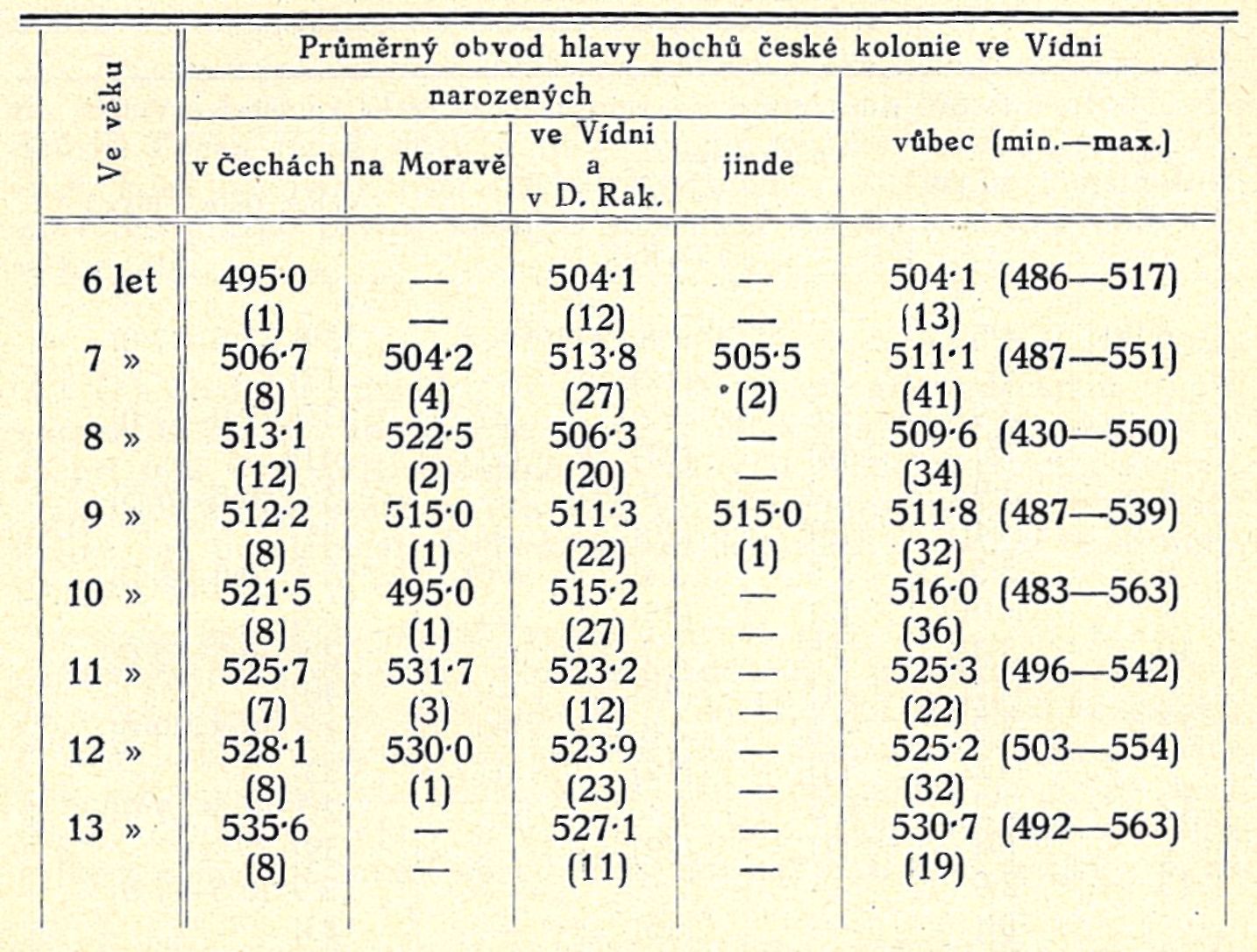 Tab. VI. Průměrný obvod hlavy hochů české kolonie ve Vídni dle původu (v cm).
