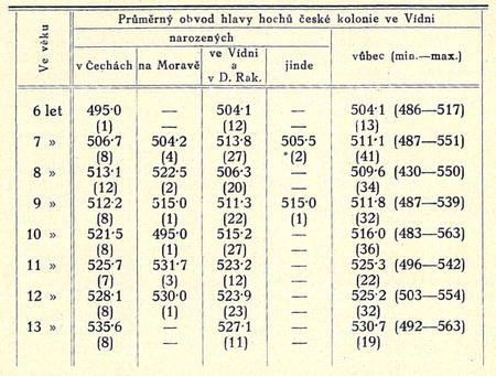 Srovnáme-li pak barvu vlasů á očí u českých dítek ve Vídni a v Dolních Rakousích narozených s dětmi jinde rozenými a teprve do Vídně přistěhovalými — viz tabulku VIII. — seznamte, že u prvých jsou světlé odstíny vlasů poněkud méně, a naopak temné barvy (tmavohnědé vlasy) poněkud silněji zastoupeny než u dítek ostatních.