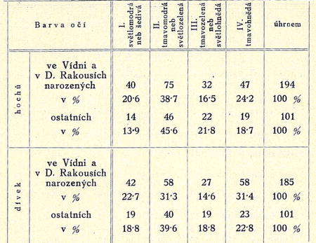 Tab. VIII. a) Barva očí dítek české kolonie ve Vídní dle původu.