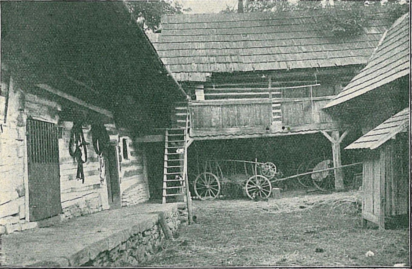 Obr. č. 4. Dvůr statku tyipu horského, těsný; pod kůlnou za vozem výjezd do vesnice.