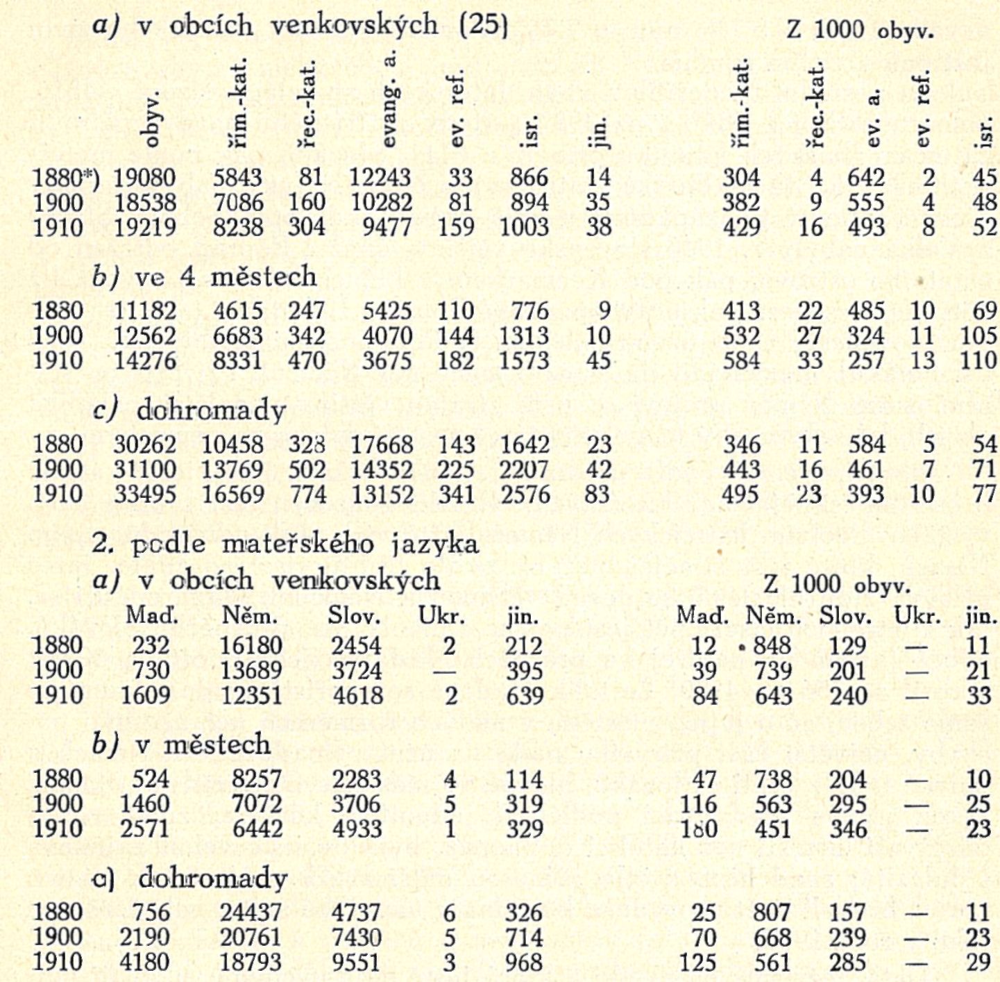 К těmto číslicím není třeba mnoho dodávati, mluví samy sebou. Čteme často o poslovenšťování spišských Němců, hořejší data ukazují zřejmě, že o něm ve vlastním slova smyslu nemůže býti řeči. Poslo-venišťují se německé obce, ale nikoliv Němci. Národnostní poměry jsou tu s dostatek charakterisovány překotným úbytkem luterských, který není arci způsobován přestupy. Původní německé obyvatelstvo podle toho odchází pryč, po případě neobnovuje se dostatečně a prázdná místa, jež po něm zůstávají, vyplňuje obyvatelsvo neněmecké a ne-luterské přicházející z okolí. Jsoiu to ponejvíce římsko-katoličtí Slováci (a Poláci), jichž silný příliv poslovenšťuje (a od severu popol-šťuje) německé obce tím, že usazuje v nich minority stále rostoucí, a vedle meh i židé, malou měrou také sjednocení Ukrajinci; dokonce i malý hlouček reformovaných (národnosti maďarské) stále roste.