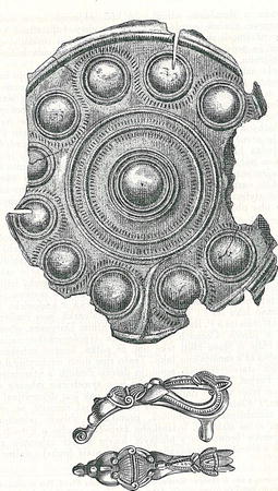 Obr. 1. Zlatý terč a bronzová sponka z mohyly v Háji u Nové Huti.