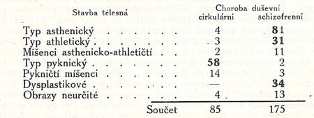 Tabulka druhá nám ukazuje, jak se rozdělily v šetření Kret-schmerově tyto typy stavby tělesné na cirkulerní a schizofrenní nemocné.