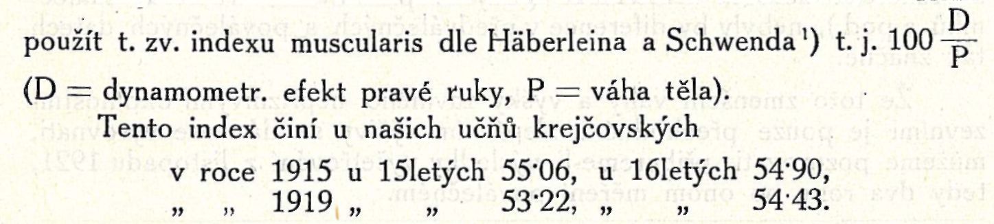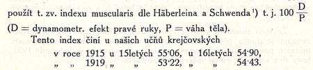 K srovnání poměrů r. 1915 a 1919 můžeme použít jednak průměrných čísel pro dynamometrický efekt pravé ruky, jednak průměrů celkové výkonnosti svalové, to jest součtu všech čtyř složek získaných dynamometrem, abychom měli účast více skupin svalových.