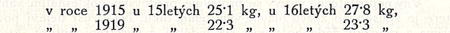 Ubytek činí tu u 151etých 2'8 kg, t. j. 11'1%, u l6letých 4'5 kg, t. j. 16'l%. I zde jako u výšky a váhy je větší úbytek v 16. roce.