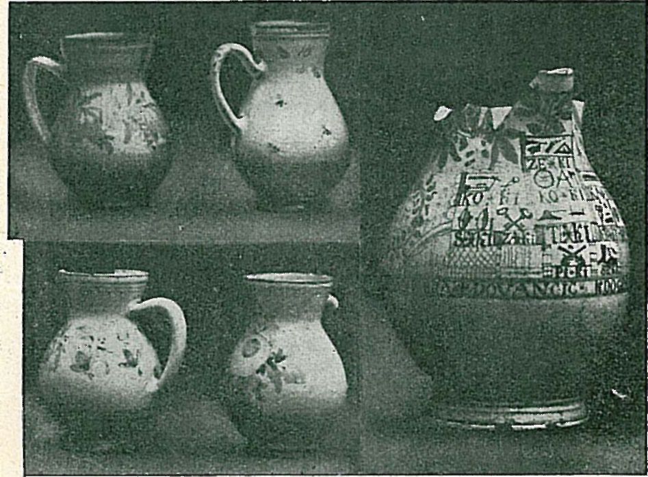 ažbánků v ivančickém museu, které jsou malovány v letech, jeho působení 1840—1860, hustou modří s nevelkou schopností výtvarnou, Chudá rostlinná komposice nedosahuje ani průměru, výrobků Hejtmánkových (obr. 8 a). ,Jsou však známy i dva typické džbány společného cechu ivančického z této doby, o nichž, bychom mohli předpokládati, že je snad při tehdejší vzájemné podpoře cechů dal sotva cech mimo město dělati. Jeden z nich,-vročen ý 1857, je v museu ivančickém (obr. 8 b), druhý, vro-čený 1850,, je v Zemském museu v Brně.12) Nepochybuji o tom, že časem se objeví zápis v některé cechovní knize, který původce jejich prozradí.'