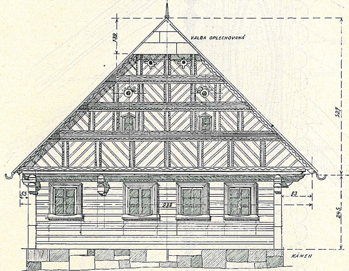 také, že nejen všechny tyto vlastnosti, ale také pouze tyto vlastnosti má venkovský člověk. Nedivme se tedy, že formy české renesance na selskou architekturu tolik zapůsobily, že lidu byly renesanční štíty a loggie tak blízké a pochopitelné a že konečně i renesanční sgrafitování, bílé na černé či tónované půdě mělo na venkově svoji odezvu v bílém vyspárování tmavého nebo barevnou hlinkou napuštěného srubu.