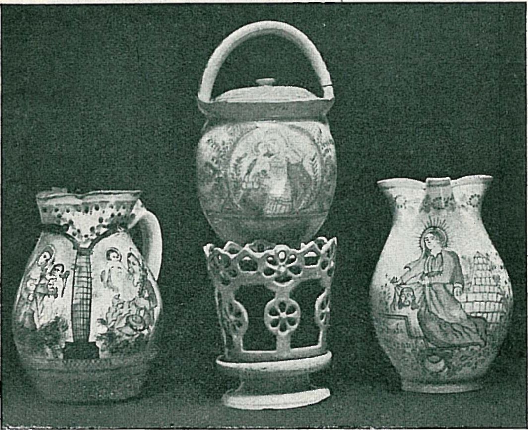 4. Mísa (č. inv. P. 8) o průměru 32 cm s okrajem vlnitě prohýbaným, zoubkovaným, modře malovaná. Na dně je malováno poprsí P. Marie s Ježíškem, pod ním vročení 1855. Na okraji jsou postavy andělíčků a na stuhách nápisy: Zum Andenken — Franz Zawřzel — Hilf Maryge — Marya Panna.