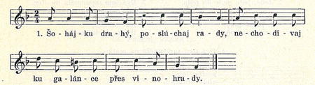 Poznámka: „Sedlcká" tančí se tak, že nejdřív šohaj píseň před muzikou zazpívá a hudba se snaží melodii zachytit, nato kývne na svou děvčinu a pleskne při tom dlaň o dlaň. Postaví se s děvčicí před muziku tak, že pravou rukou drží její levou ruku a kolébají se chvíli na miste vpřed a vzad, pohybujíce současně