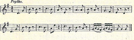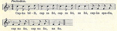 Tančí se tak, že děvče houpajíc rukama do zad ustupuje, kdežto šohaj dle taktu jako žába na rukou i nohou za ní po zemi poskakuje. Tónina písničky se neustále mění, vždy jeden verš o tón níže a druhý zase o tón výše atd.