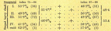 Tabulka VIII. poskytuje nám nahoře přehled roztřídění žáků dle indexů hlavy a dle barvy vlasů. Hoši s nejsvětlejšími vlasy kupí se kolem čísla 86, s nejtemnějšími vlasy kol 88, obě střední skupiny tvoří jaksi přechod.