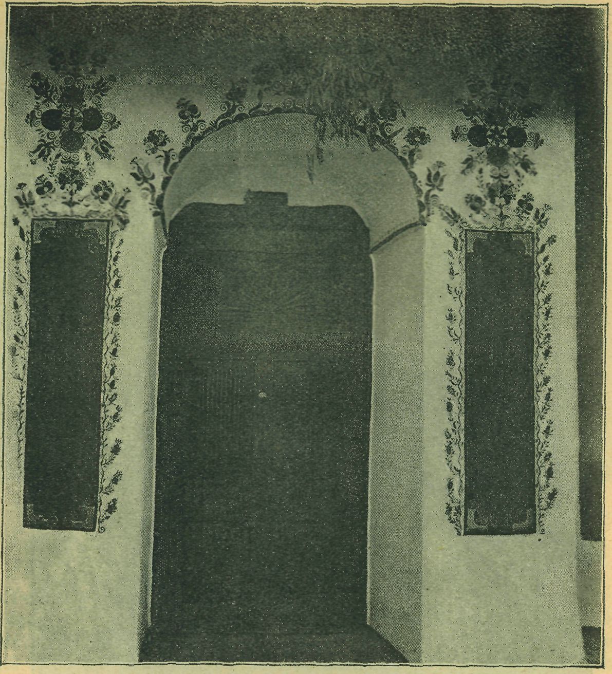 Barvy ostatní plní, různě se střídajíce, tyto ohraničené tvary. Umělecký klid v komposici nastal převahou černé barvy nad ostatními. Vrchní lemovací plocha je žlutě podložena a květy jsou na ní docela tímže způsobem provedeny, jak při podnoži uvedeno. Avšak i z takové ukázky může si málo kdo představiti účinek celé místnosti, totiž síně a kuchyně. Plochy ostatních stěn ovšem byly jen jednobarevné nebo naznačeným kvádrováním a malými květovými motivy přizdobené, ale oba pasy, vrchní a spodní, vroubí celou místnost, jdou i do komína, a pohne Vás to až k smíchu, když uzříte i veškeré plochy v komíně a ohniště, ba někdy i ohniště samo plué květů a rozvilin. To ovšem dá, se vysvětliti jen tím, že v létě vaří hospodyně jinde.