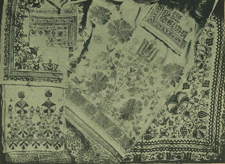 Čés. 9. Ukázky starých výšivek z Břeelavska na Moravě. (Fotografie prof. J. K 1 v a n ě.)
