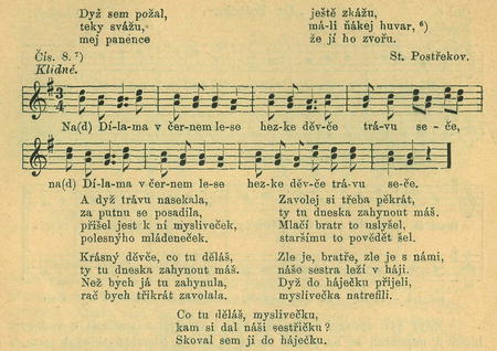 Na kolik se týče slovní stránky písní, nemohu s takovou určitostí o ní se pronášeti jako o nápěvech, poněvadž celého Erbena na paměť neznám. Zásadou mi bylo psáti vše, co lid ví a zná, to proto, že 1. o některých písních, mnou sebraných, jsem se hned přesvědčil, že v Erbenovi vůbec nejsou, nebo 2. že jsou to odchylná, zápisu hodná znění; a konečně 3. proto, že sám jsem některou píseň v několika různých změnách slyšel a zapsal. Lépe je psáti píseň dvakrát, než ji ztratiti. Mám tedy za to, že z těch šesti asi set mých textů dobrá polovina marně psána nebyla. —