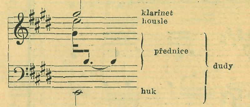 Dudy mají trojí úkol: 1. opakují melodii (o oktávu níže než klarinet), 2. častým přibíráním ramenářské- dominanty h způsobují hudbu plnější, a 3. stále znějícím velkým E (ze zadní píšťaly čili h u k u) obstarávají bas, čehož následkem celá skladba jest prodlevou na tonice. Partiturové schéma „selské muziky" se dá naznačiti stručně takto :