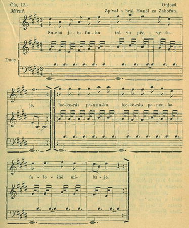 Nejzajímavějším pak dokladem tu je přiklad následující, jenž podává toliko zpěv a hru dudákovu. Zapsal jsem to od záhořan-ského dudáka, zvaného Haněl, jenž je dobrým zpěvákem a jen málo kdy dudá „mlčky" (c. 12.).