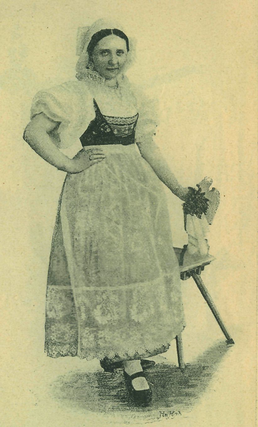 měnek" či „na pokos". Košilka bílá nechávala hrdlo nahé, jež ozdobováno bývalo stříbrnými řetízky se zavěšenými stříbrnými penízky i dukátky. Sukně nošeny buď z látky květované nebo měnivé, přes ně zástěrka tylová, vyšívaná, punčochy u děvčat vždy bílé a černé střevíčky." (Světoz. 1893, 540.)
