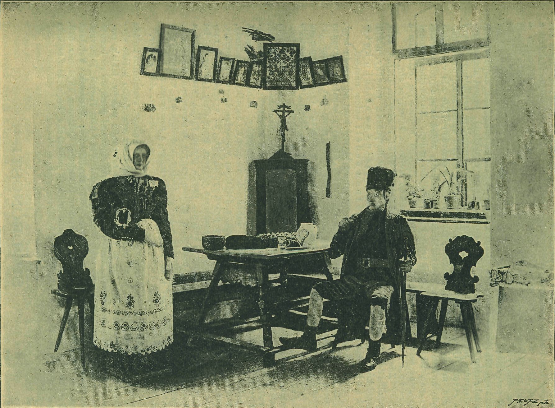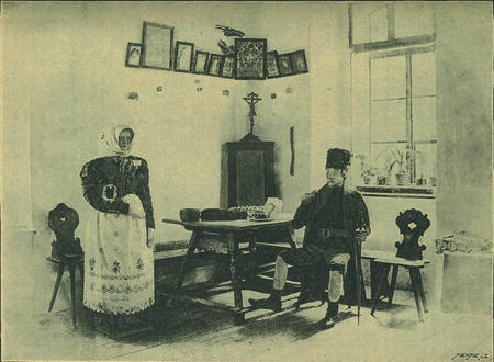 Čís. 4. Národopisná výstava v Netolicích. Kout světnice s figurínami kroje netolického. (Fotografie J. Příbramského v Českých Budějovicích.)