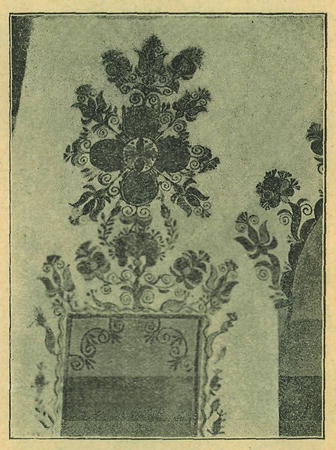 Poněvadž jsou pak tyto poslední památky staršího data, než vše před tím uvedené, mohlo by se tvrditi, že se snad jablíčka, tulipány a karafiáty dostaly do lidového umění československého původně z Čech. Ale ani tohoto původu nemůžeme nijak obhájiti. Podobné umělé vyšívání zlatem, jak jsme jej uvedli, neobjevuje se jen v Čechách ; známe podobné práce i z Moravy, Rakous, Uher, Bavor a jiných zemí, tak že je pro veškeré tyto země pro konec XVI. a XVII. století význačně typické. Formy tyto nejsou pak jen na vyšívání, nýbrž i na íoajolikách, malbách a jiných umělecko-průmy-slových předmětech. Pokud by se nenalezl další nějaký důkaz, dlužno z té příčiny se dohadovati, že formy uvedené byly v XVII. stol. v umělém slohu střední Evropy, tedy v renaissanci obvyklé a že se pak dostaly prostřednictvím kostelního vyšívání a majolikových ozdob v lidovou ornamentiku, která si v nioh velice libovala a naučila se jich časem užívati.
