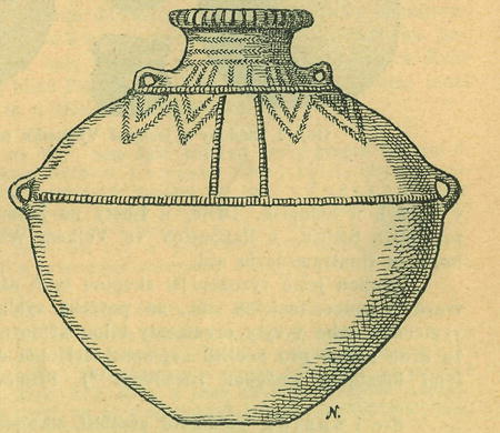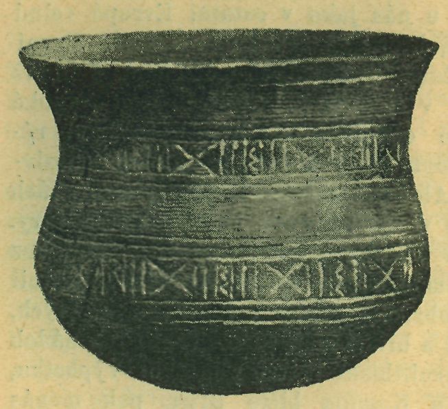 pásky vodorovně kolem nádob běžící — nádoby toho druhu jsou hojné v západní Evropě, zejména v Anglii a Francii, u nás vyskytují se jen porůznu (obr. 2.), a to v přechodu z neolithu k době bronzové13) — nebo tvoří různé, svisle a šikmo v úhlech k sobě sestavené pásky, k pupíkům nebo úškám paprskovitě se sbíhající, jejichž linie skládají se z řady píchaných bodů, čárek aneb úhlov-níků. Typickým nalezištěm tohoto druhu nádob je na př. známé neolithické pohřebiště u Monns-heimu v Porýnsku. 14) Typ zove