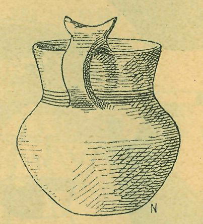 Také zvláštní skupina nádob t. zv. dvojitých (srv. na tabulce obr. 2.) a nádob dírkovaných (obr. 5.), jejichž účel není na jisto postaven (sloužily nejspíše k hotoveni sýra), vyskytuje se u nás nej-častěji v nálezech z doby neolithické a doby nejblíže jí následující. 17)