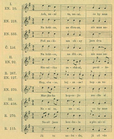 127 (Hop, chaso) jsou sobě tak blízké, že stačila na ně jedna řádka notová. Kde bylo na výběr, zvoleny i texty nejshodnější. Poslední nápěv, R. 115, jest o čtyři takty delší než ostatní; dle této analogie musí se ovšem i při nápěvu prvním, EN. 10, po taktu 12. opakovati celá první jeho část (takty 1.—8.) a ne toliko 5.-8. takt, když zpívají se k němu slova 4. Já tu nebudu (dle prvního vydání Erbenových Písní: Ach, já tu nebudu).