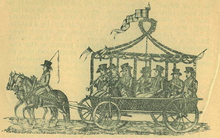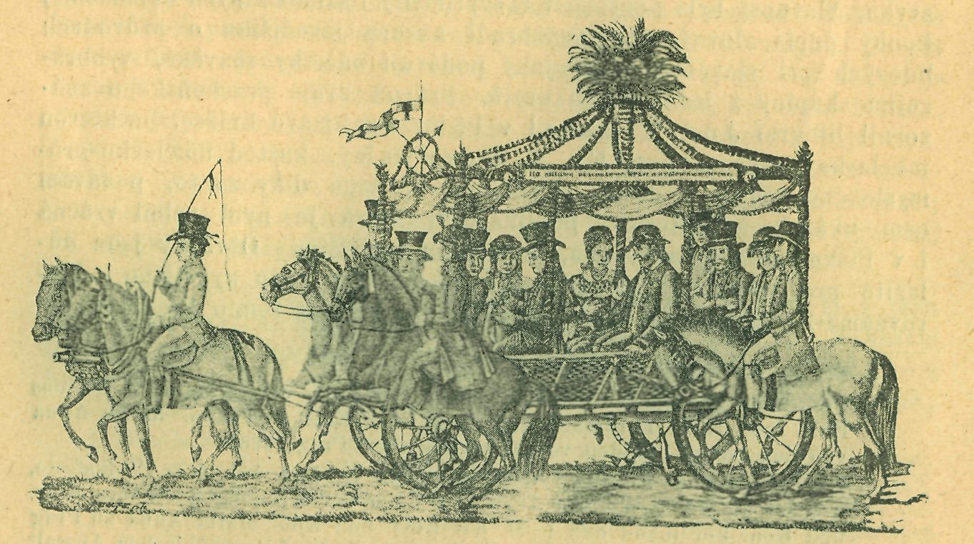 Čís. 2. Vůz s nevěstou, s družbou, se dvěma svědky a několika hosty, s nápisem : „Od Vltavy přicházíme, krále a královnu velebíme,"